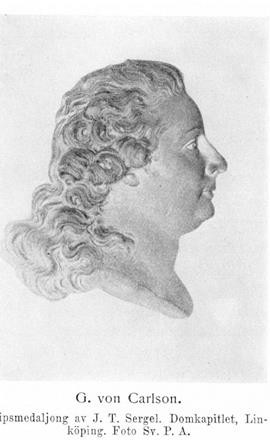 2. Johan Gustaf von Carlson, f. 15 nov. 1743 på Långbro i Vårdinge socken, d. 10 dec. 1801 i Stockholm, begraven i parken på Mälby. Föräldrar: kammarherren Johan von Carlsson och Maria Lovisin. Student i Uppsala 12 apr. 1760; erhöll testimonium academicum 10 dec. 1761. E. o. kanslist i krigsexpeditionen 27 maj 1762; avlade examen i kanslikollegiet 29 mars 1763; kopist 6 juni 1764; kanslist 1...